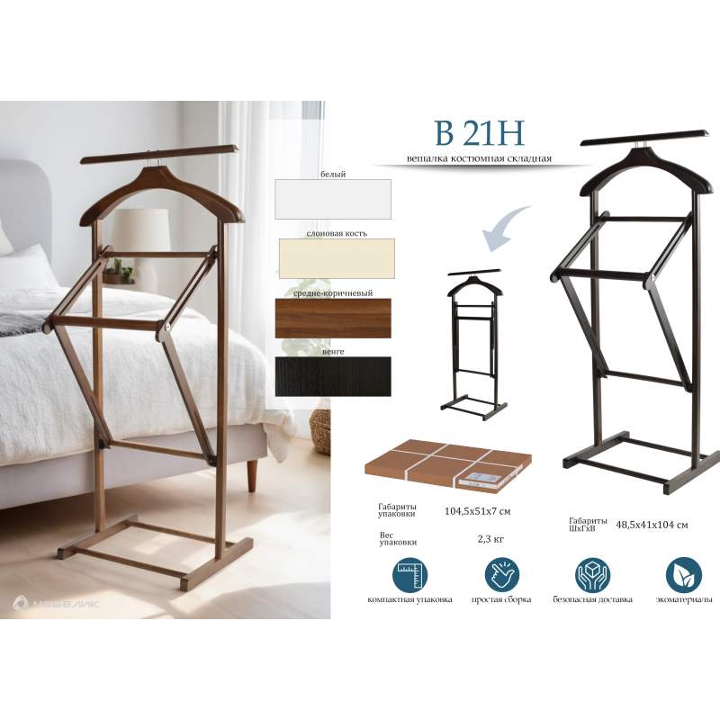 Костюмная вешалка В 21Н – это стиль и практичность в одном! Благодаря своей продуманной конструкции вешалка сочетает в себе компактность и вместительность одновременно! Вешалка имеет складные детали, которые при необходимости можно будет легко выдвинуть и получить дополнительное место для хранения вещей, а также вернуть обратно при перестановке. Конструкция выполнена из массива бука, что говорит о надёжности и долговечности изделия. Преимущество костюмной вешалки – наличие множества различных поверхностей для хранения любой одежды. На выбор представлены четыре стильных варианта расцветки изделия на любой вкус.