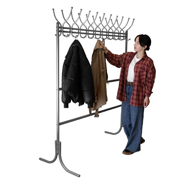 Вешалка рассчитана максимально на 20 посетителей: 20 крючков для одежды, столько же для головных уборов