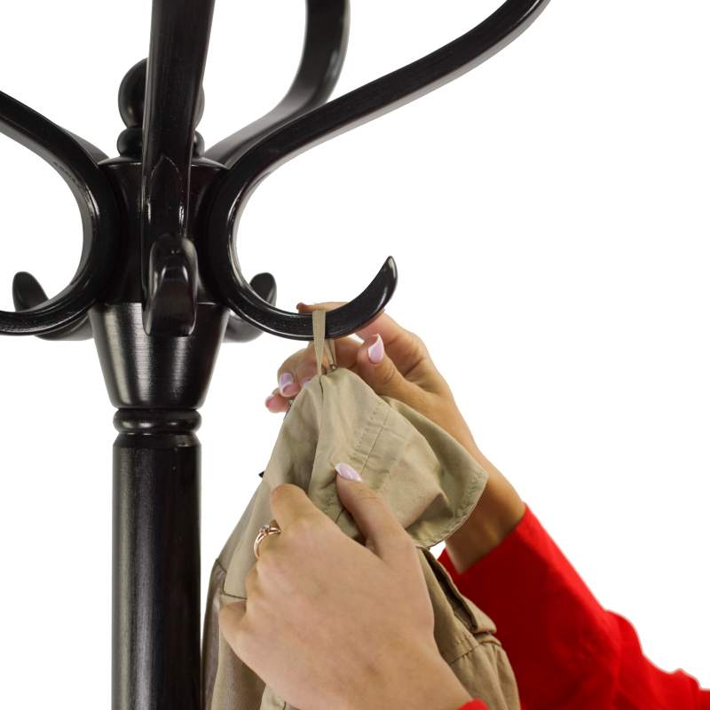 Вешалка компактно упакована и для ее транспортировки не требуется прибегать к помощи грузового такси, ее можно транспортировать даже в общественном транспорте. При этом она легко собирается – все элементы просто скручиваются между собой. За счет разноса опор вешалка устойчива, а толщина крючков позволяет уверенно пользоваться вешалкой даже в заведениях с большой проходимостью.