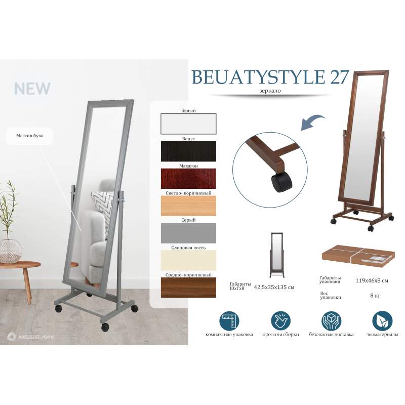 Напольное зеркало Beauty Style 27 подойдет для оформления интерьера квартиры или дома. Деревянные элементы выполнены из массива бука и ХДФ, что гарантирует прочность изделия и долгий срок службы. Высококачественное зеркальное полотно обеспечивает идеальное отражение. Фиксатор угла наклона позволяет регулировать отражение. Благодаря оптимальным размерам зеркала Вы можете смотреться в полный рост, примеряя любимые наряды.
