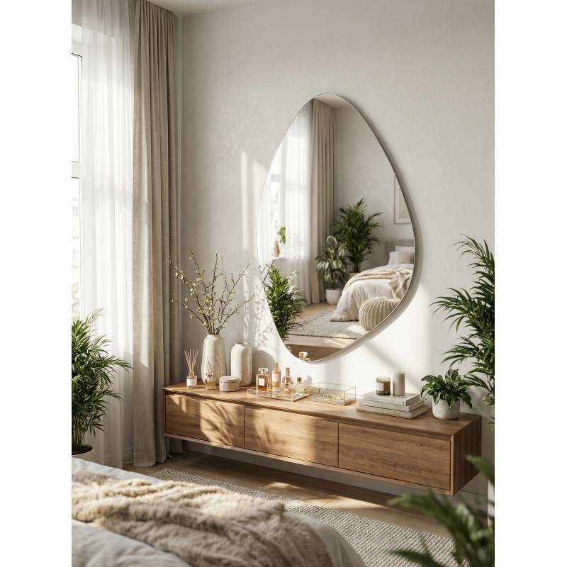 Настенное фигурное зеркало Сельетта-8 без рамы в современном органическом стиле станет выразительным акцентом в любой комнате, визуально расширит пространство и добавит больше естественного света в интерьер. Лаконичный дизайн идеально подходит для современных интерьеров в стиле минимализм и сканди: плавные асимметричные линии создают эффект дизайнерского объекта, поэтому зеркало уместно в прихожей, спальне, гостиной, гардеробной или домашнем кабинете.