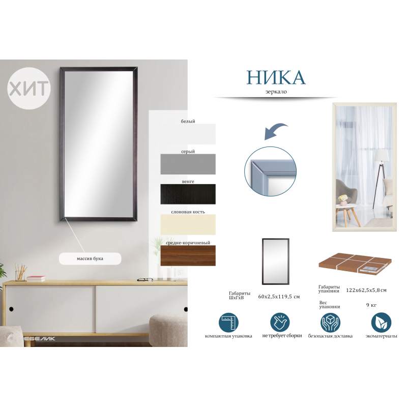 Зеркало настенное Ника белый 119,5 см x 60 см