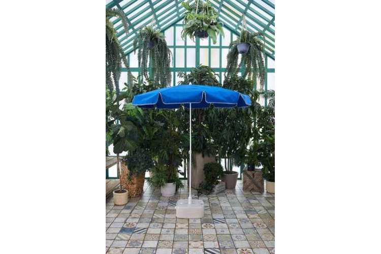 Зонт BREEZE 200. Диаметр купола 2.0 м, высота 2.2 м, 10 стальных спиц. Диаметр спиц 3.8 мм. Ткань купола - полиэстер 200 гр. Края купола выполнены с воланом. Цвет: Синий. Другие цвета уточняйте у менеджеров. В комплекте пластиковая база-основание, объем 35л. Базу можно наполнить водой или песком. Производство: Турция.